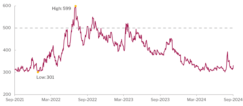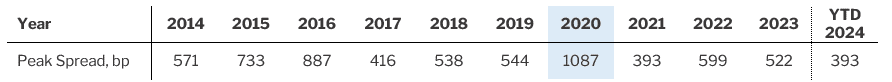 It is noticeable that 2024 so far is tied with 2021 as the lowest peak spread value since the Global Financial Crisis. We believe the market’s apathy for potential risk repricing bears a lot of resemblance to 2021. There clearly are differences between the two market environments. We thought that the easier trade three years ago was to be short duration rather than risk assets, while now the opposite is true. Even with the strong recovery into the end of August, the increased volatility in recent weeks argues to us that market drivers are shifting which should eventually lead to better opportunities.