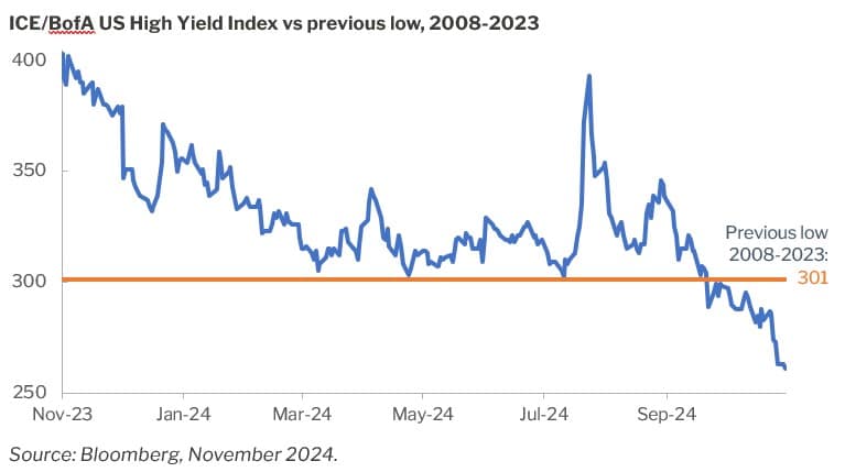 As of the time of writing, the bottom for high yield spreads in the immediate euphoria of the election was 261bp, which is 40bp through the 2008-2023 low and just 20bp above the 2007 bottom of 241bp. Much like the move lower in spreads over the past two months, in 2007 the bottom in spreads was accompanied by a significant sell off in US treasuries. The November low in spreads occurred with the 5-year treasury yield of 4.31% while the 2007 bottom coincided with a 5-year yield of 4.97%. So, although spreads are slightly higher than 2007, the all-in yields are worse for the high yield market now than they were then. While in the short-term spreads could continue to tighten, the chances of a material spread widening event in the next six months has increased in our view.