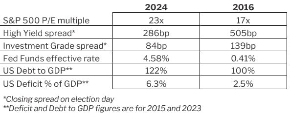 While we agree with the market’s assessment of regulation and tax policy under Trump as being supportive to valuations, there are some negative aspects to his policy playbook that the market does not seem to be focused on, namely mass deportations and increased tariffs. Both of Trump’s likely immigration and trade policies are clearly inflationary which was evident in the reaction from bond markets in both the lead up to the election and once the outcome was known. The market appeared to reflexively go back to the 2016 playbook, when the reality is that the set-up is quite different this time.