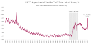 According to Bloomberg, as of May 13, post the dramatic roll back of China tariffs, the effective US tariff rate is now around 13%, dramatically higher than the effective rate on March 31 which was itself a spike from the status quo coming into 2025. This is effectively a tax paid by companies and consumers and a headwind for economic growth in 2025.