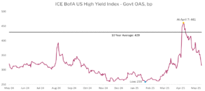While equity markets are higher and credit spreads are tighter than they were before “Liberation Day”, the event itself could have lasting implications for both the economy and markets. Container shipments from China to the United States fell in April and will take weeks to recover, reducing sales and profits for affected industries. The US Treasury market saw a dramatic sell-off in mid-April, some of which was likely driven by foreign investors seeking to reduce their US exposure. With the US Treasury running large fiscal deficits, reduced demand for their issues from foreign buyers has the potential to impact risk premiums.