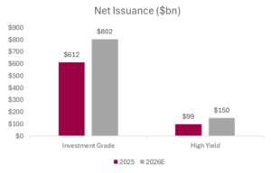 January saw surprisingly little AI related issuance as we didn’t see any issuance in investment grade or high yield markets. February started with a bang as Oracle issued $25 billion in bonds to fund their data center buildout on the first business day of the month, with additional IG, high yield and ABS issuance taking the total to almost $50 billion in US credit markets in the first half of the month. With large tech companies continuing to raise their capital expenditure budgets, we anticipate a very strong year for issuance in 2026. JP Morgan is projecting record investment grade issuance and a noticeable uptick in high yield issuance this year. With about $300 billion of IG issuance relating to AI infrastructure.