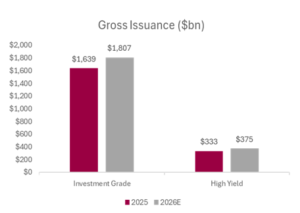 January saw surprisingly little AI related issuance as we didn’t see any issuance in investment grade or high yield markets. February started with a bang as Oracle issued $25 billion in bonds to fund their data center buildout on the first business day of the month, with additional IG, high yield and ABS issuance taking the total to almost $50 billion in US credit markets in the first half of the month. With large tech companies continuing to raise their capital expenditure budgets, we anticipate a very strong year for issuance in 2026. JP Morgan is projecting record investment grade issuance and a noticeable uptick in high yield issuance this year. With about $300 billion of IG issuance relating to AI infrastructure.