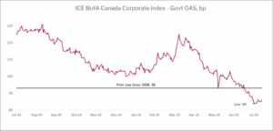 While high yield spreads stalled out early in July, other credit markets continued to rally with limited pushback from investors. Canadian IG spreads rallied through July, with the ICE BofA Canada Corporate Index making a new low in spread since 2007 in early August. Canadian credit markets are often an attractive hiding place after US markets have seen material spread compression, but this is the most stretched we have seen Canadian investment grade credit spreads.