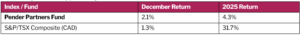 The Pender Partners Fund returned 2.1% in December, bringing YTD performance to +4.3%1. The Fund’s all-cap mandate provides flexibility to pursue mispriced opportunities across market segments and geographies. While broader market conditions appeared relatively stable, performance dispersion remained elevated, with returns driven by a narrow set of market leaders. In this environment, dispersion weighed on the Fund’s results. We view this as a reminder that periods of concentrated leadership can be challenging for diversified, active strategies, but also as the backdrop in which disciplined, bottom-up stock selection has historically created opportunity over time.