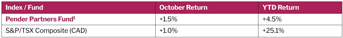 The Pender Partners Fund gained 1.5% in October and 4.5% YTD. The Fund’s all-cap mandate provides the flexibility to capture opportunities across market segments and geographies. As of quarter end, the portfolio comprised of 35 holdings with a 44.8% exposure to US equities and 42.1% exposure to Canadian equities. Top holdings are within Industrials, Technology and Financial Services which together account for nearly 50% of sector exposure.