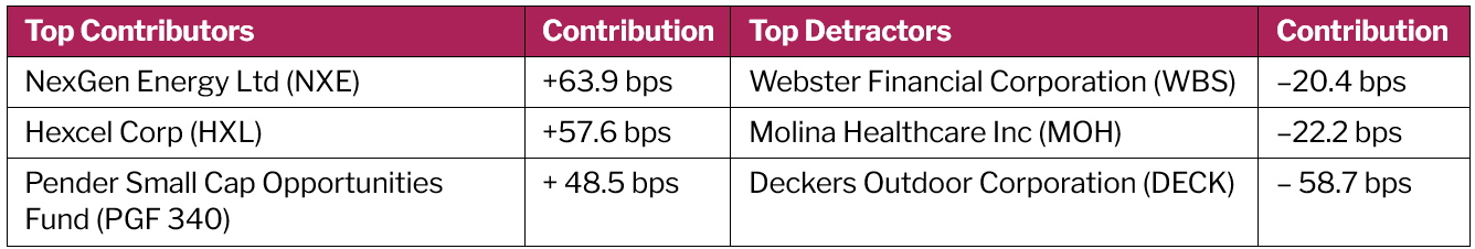 The top Fund contributor in October was NexGen Energy, as its ~C$1 billion equity financing materially reduced funding risk for the Rook I project. With the company now effectively fully funded and approaching key permitting milestones, the stock re-rated higher on improved visibility and reduced execution risk. We continue to follow the strengthening uranium cycle, supported by tight supply, rising utility demand, and growing interest in nuclear energy. Other notable movers included Hexcel Corp, a leading US industrial materials company specializing in advanced lightweight composites such as carbon fiber, fabrics, and resins. The company reported quarterly earnings that were slightly ahead of consensus, and we believe Hexcel remains well positioned to benefit from strengthening investor confidence in the original equipment cycle and the expected ~50% increase in widebody revenues over the 2026–2028 period. Finally, the position in the Pender Small Cap Opportunities Fund added to performance by providing exposure to undervalued Canadian small caps, reinforcing the Fund’s bottom-up value orientation. Our USD cash positions also contributed positively, as the CAD weakened against the USD amid widening interest-rate differentials and soft Canadian economic data. The strengthening USD increased the value of these holdings when translated back into CAD, boosting overall performance.