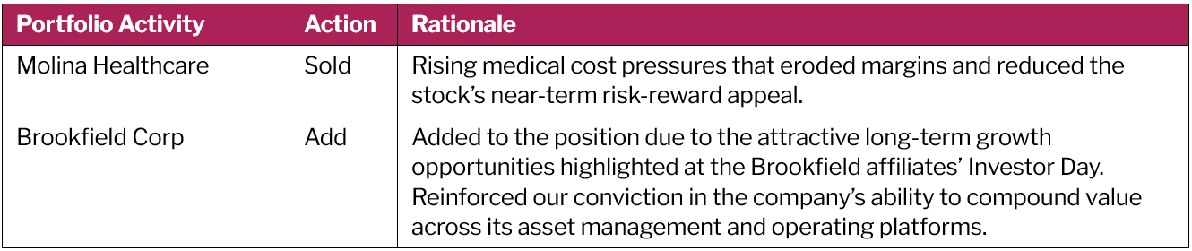 Weaker performers included Molina Healthcare, which we exited during the month due to a less favourable operating environment. As a low-cost, Medicaid-focused managed care organization, Molina is particularly exposed to rising medical costs and ongoing regulatory pressures. Deckers was also a detractor despite reporting solid quarterly results, as full-year guidance came in softer than expected. Management cited a more cautious US consumer, tariff-driven cost increases, and the risk of slowing growth and tightening margins.