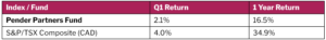 1 All Pender performance data points are for Class A of the Fund. Other classes are available. Fees and performance may differ in those other classes. Standard Performance Information for Pender’s Equity Funds may be found here: https://penderfund.com/fund/pender-partners-fund/.