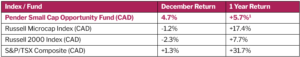 1 All Pender performance data points are for Class F of the Fund. Other classes are available. Fees and performance may differ in those other classes. Standard Performance Information for the Fund may be found here: https://penderfund.com/fund/pender-small-cap-opportunities-fund/.