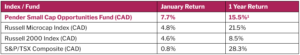 1 All Pender performance data points are for Class F of the Fund. Other classes are available. Fees and performance may differ in those other classes. Standard Performance Information for the Fund may be found here: https://penderfund.com/fund/pender-small-cap-opportunities-fund/