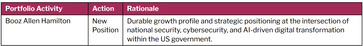 We initiated a position in Booz Allen Hamilton (BAH), an advanced technology company delivering services to the US’s most critical defense, civil, and national security priorities. The company’s work spans national defense, cybersecurity, infrastructure protection, and digital modernization, helping governments and organizations operate more securely and efficiently. Leveraging deep expertise in AI, cybersecurity, and engineering, Booz Allen delivers advanced, technology-driven solutions. Through continued investment in talent, partnerships, and new business models, the company is positioning itself for sustainable, high-quality growth.