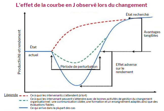 En dépit de cette progression rapide, le réel retentissement économique de l’IA reste inconnu. On peut mieux comprendre ce paradoxe apparent en se penchant sur la courbe en J de la productivité,4 which describes an initial phase in which technological adoption suppresses measured productivity. During this period, organizations incur significant costs related to infrastructure investment, workflow reconfiguration, and workforce retraining. Only once these complementary investments are fully integrated do productivity gains begin to materialize at scale.