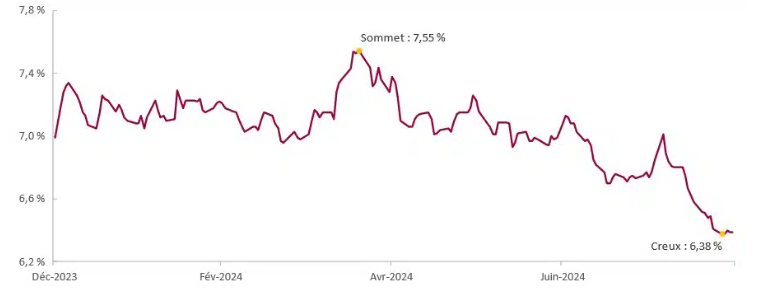 Les écarts continuent d’avoir l’air de coûter cher selon les standards historiques. Avec la réévaluation du prix des titres d’État, les taux de rendement tout compris valent nettement moins qu’au début de l’année. Bien que, tout au long de l’année, les écarts aient été chers par rapport aux niveaux historiques, un contre-argument raisonnable selon lequel les rendements tout compris demeuraient attrayants circulait depuis quelques mois. Avec la baisse des taux, nous croyons que cette théorie est de plus en plus difficile à défendre. Le segment BB-B du marché américain à rendement élevé, qui exclut les 12 % au bas du marché, s’est effondré le 26 août jusqu’à atteindre un pire rendement envisageable (ou YTW) de 6,38 %, soit plus de 100 pb sous le sommet d’avril.