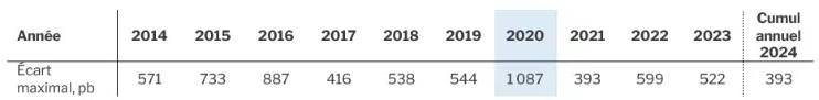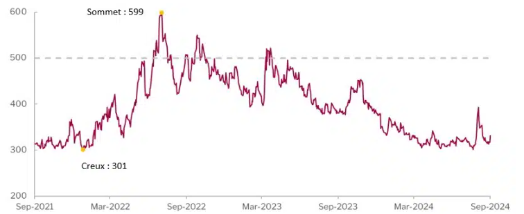 Notons que 2024 est, jusqu’à ce jour, à égalité avec 2021 quant à l’écart maximal le plus faible depuis la crise financière mondiale. Nous croyons que l’apathie du marché envers une éventuellement réévaluation du risque ressemble beaucoup à celle de 2021. Il y a pourtant des différences évidentes entre le contexte boursier de 2021 et celui d’aujourd’hui. Il y a trois ans, nous pensions que les investissements de courte durée étaient préférables aux actifs risqués, mais c’est tout le contraire maintenant. Même si l’on tient compte de la forte reprise qui s’est produite à la fin d’août, la volatilité accrue des dernières semaines nous donne à croire que le marché est en train de changer, ce qui devrait donner lieu à des occasions plus intéressantes.