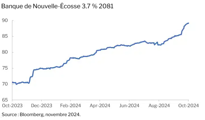 - Nous avons vendu, entre autres, nos positions dans les billets avec remboursement de capital à recours limité émis en 2021 par des banques canadiennes en dollars canadiens, billets que nous avons accumulés en 2023 pour 75 $ et moins. En octobre, nous avons vendu à profit le gros de nos avoirs.