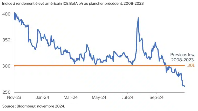 Alors que nous écrivons ces lignes, les écarts des titres à rendement élevé ont atteint un plancher de 261 pb lors de l’euphorie qui a immédiatement suivi l’élection. C’est 40 pb au-dessus du point le plus bas entre 2008-2023 et à peine 20 pb au-dessus du plancher de 241 pb de 2007. Tout comme cela a été le cas lors de la réduction des écarts des deux derniers mois, les écarts minimaux de 2007 ont été accompagnés par une liquidation notable des bons du Trésor américain. En novembre, les écarts ont baissé alors que le rendement à cinq ans des bons du Trésor était de 4,31 %. Lors de la descente de 2007, le taux de rendement à cinq ans était de 4,97 %. Bref, même si les écarts sont légèrement plus marqués qu’en 2007, les taux de rendement globaux du marché à rendement élevé sont pires qu’ils l’étaient alors. Bien que les écarts puissent à court terme continuer à se resserrer, les probabilités qu’ils s’élargissent considérablement au cours des six prochains mois se sont accrues selon nous.