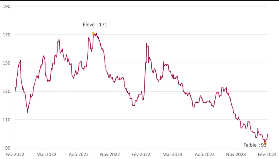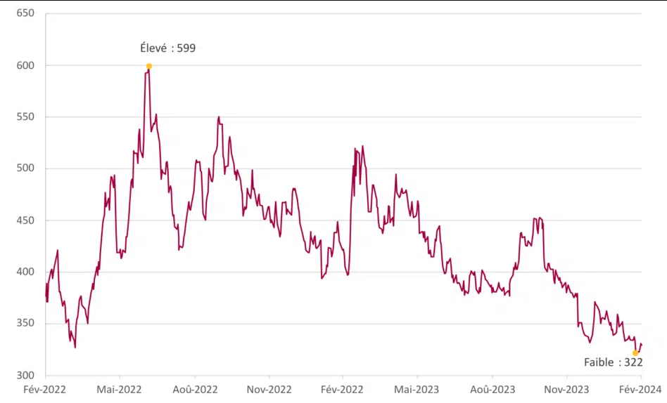 Les écarts en matière de crédit ont encore été favorables à de bonnes performances en février. Les titres de catégorie investissement et ceux à rendement élevé ont établi de nouveaux records en touchant un creux vers la fin du mois : les deux marchés ont affiché les écarts les plus faibles depuis le début de 2022. Le rendement total des titres à revenu fixe a été restreint par ceux en hausse des obligations gouvernementales qui ont subi les effets tant de la demande que de l’inflation persistante de la composante services de l’IPC – ou inflation « super core » – aux États-Unis. L’indice américain à rendement élevé ICE BofA a dégagé un rendement de 0,3 % tant ce mois-ci que depuis le début de l’année. Les écarts du côté des titres à revenu élevé se sont rétrécis de 30 points de base au cours du mois pour le terminer sur un écart de rémunération corrigé des effets de la clause de remboursement anticipé (OAS) de 329 points de base, à moins de 30 points de base de l’écart le plus bas des 16 dernières années.