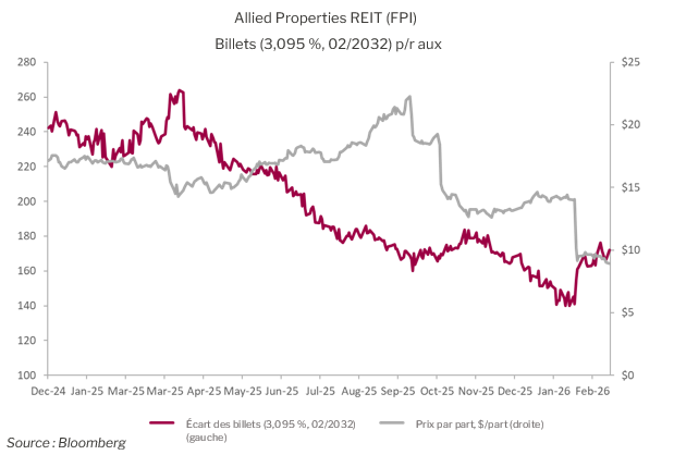 Au cours de la dernière année, nous avons constaté le resserrement considérable des écarts touchant aux titres de catégorie investissement, parfois en présence d’une détérioration fondamentale marquée. Sur le marché canadien, mentionnons à titre d’exemple Allied Properties REIT (TSX : AP.UN), dont la piètre performance sur le plan des opérations et des actions a été balayée du revers de la main par le marché du crédit et récompensée par des écarts plus serrés.