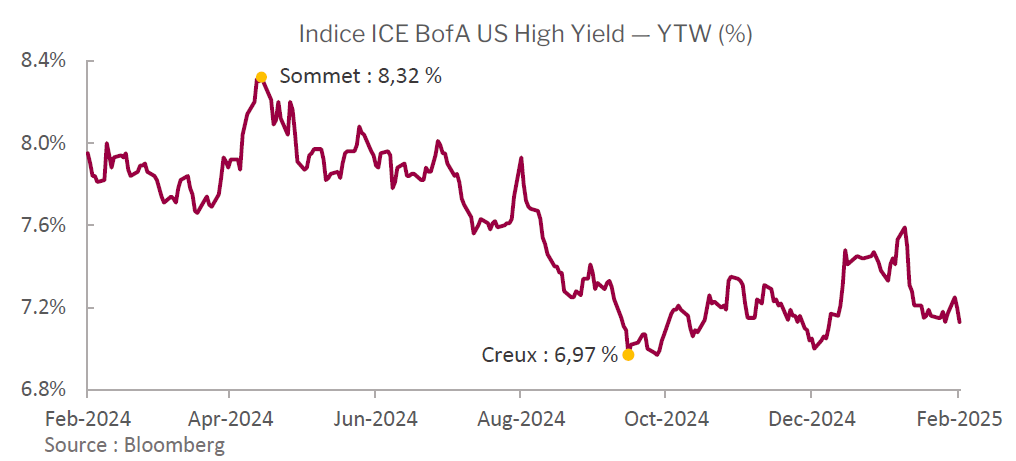 Les marchés ont rebondi en janvier après avoir terminé 2024 en douceur. Les écarts par rapport aux titres à rendement élevé se sont resserrés de 24 pb en janvier. Ils ont clôturé le mois sur un écart de rémunération corrigé des effets de la clause de remboursement anticipé (OAS) de 268 points de base par rapport aux titres d’État, après avoir chuté le 22 janvier à 259 pb, un creux inégalé depuis plusieurs décennies. L’indice de référence du Fonds, soit l’indice HFRI Credit, a rapporté 1,0 % en janvier.