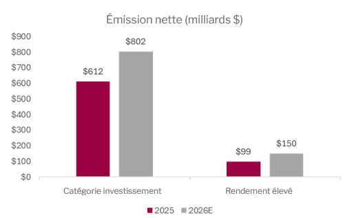 En janvier, il y a eu très peu d’émissions liées à l’IA, ce qui est étonnant. En fait, nous n’en avons vu aucune sur le marché des titres de qualité investissement ou à rendement élevé. Février s’est ouvert sur un coup d’éclat. Au premier jour, Oracle a émis 25 milliards $ d’obligations pour financer la construction de ses centres de données. Cette émission supplémentaire de titres de qualité investissement, à rendement élevé et adossés à des actifs a porté le total à près de 50 milliards $ sur les marchés du crédit états-uniens au cours de la première moitié du mois. Étant donné que les grandes entreprises technologiques continuent d’accroître leur budget de dépenses en capital, nous anticipons que les émissions seront abondantes en 2026. JP Morgan prévoit que les émissions de titres de qualité investissement fracasseront un record et que les émissions des titres à rendement élevé augmenteront significativement cette année. Notamment, environ 300 milliards $ de titres de qualité investissement seront liés aux infrastructures de l’IA.