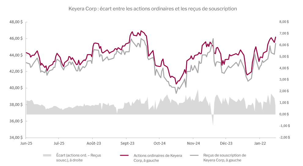 Nous avons mis en place une position d’arbitrage intéressante dans les reçus de souscription de Keyera Corp. (TSX : KEY/R) en utilisant les actions ordinaires de l’entreprise en guise de couverture. Les reçus de souscription deviendront des actions ordinaires lorsque l’acquisition par l’entreprise des actifs canadiens de Plains All American’s (NYSE : PAA) sera conclue, ce qui devrait avoir lieu au cours du trimestre selon les dires de la société. Habituellement, dans une situation d’arbitrage sur fusion ayant une forte probabilité de se conclure, les écarts se resserrent au fil du temps. Cela n’a pas été le cas pour les reçus de souscription de Keyera qui, au cours des dernières semaines, se sont souvent négociés avec un escompte d’environ 2 à 3 % par rapport à l’action ordinaire de l’entreprise. Comme la transaction doit être conclue d’ici deux mois, cet écart constitue à notre avis un usage intéressant du capital. Le fait qu’une entreprise canadienne achète les actifs canadiens d’un opérateur états-unien peu enclin à y investir un capital appréciable va tout à fait dans le sens des priorités avouées du Canada. Puisque la transaction est pleinement financée, le seul obstacle pouvant s’opposer à sa conclusion est l’approbation des instances réglementaires fédérales.