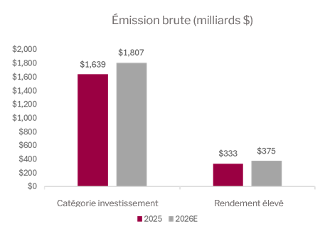 En janvier, il y a eu très peu d’émissions liées à l’IA, ce qui est étonnant. En fait, nous n’en avons vu aucune sur le marché des titres de qualité investissement ou à rendement élevé. Février s’est ouvert sur un coup d’éclat. Au premier jour, Oracle a émis 25 milliards $ d’obligations pour financer la construction de ses centres de données. Cette émission supplémentaire de titres de qualité investissement, à rendement élevé et adossés à des actifs a porté le total à près de 50 milliards $ sur les marchés du crédit états-uniens au cours de la première moitié du mois. Étant donné que les grandes entreprises technologiques continuent d’accroître leur budget de dépenses en capital, nous anticipons que les émissions seront abondantes en 2026. JP Morgan prévoit que les émissions de titres de qualité investissement fracasseront un record et que les émissions des titres à rendement élevé augmenteront significativement cette année. Notamment, environ 300 milliards $ de titres de qualité investissement seront liés aux infrastructures de l’IA.