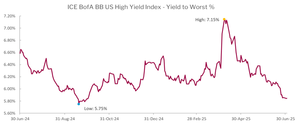Les écarts des titres BB, qui sont de bons indicateurs pour le Fonds, se situaient au début de juillet à 4 pb au-dessus du plancher de février. Au début de l’année, les écarts étaient à leur point le plus bas depuis 1997. Quant aux rendements globaux, le marché des titres à rendement élevé s’annonce encore pire en juillet qu’en février.