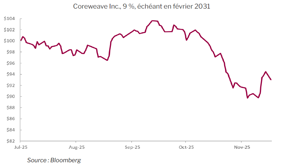 La volatilité a fourni au Fonds plusieurs occasions d’investir en novembre. Nous avons pris une position dans un nouveau venu sur la scène des centres de données de l’IA, Cipher Compute LLC, une filiale de Cipher Mining Inc (Nasdaq: CIFR) À l’instar de notre position dans Wulf Compute LLC (Nasdaq: WULF), Cipher bénéficiera du soutien de Google lorsque son centre de données sera achevé et fonctionnel. Nous nous portons garants de la construction du centre malgré le risque qui nous semble gérable. À notre avis, ces deux actifs sont les plus intéressants sur le plan de la valeur parmi toutes les créances des centres de données en IA, y compris les émissions de qualité investissement. Nous avons pu ajouter ces deux positions en novembre en fonction d’un rendement de 7 % pour une échéance de cinq ans et d’une clause d’amortissement une fois les centres construits. L’écart de crédit pour les obligations à cinq ans d’Alphabet Inc. est d’environ 30 points de base pour un rendement à l’échéance légèrement supérieur à 4 %. Encore plus éloigné de la courbe de risque, CoreWeave — qui a eu l’honneur d’être le premier titre en IA à accéder au marché à rendement élevé plus tôt cette année — a tiré avantage d’une très importante réévaluation de son profil de risque sur le plan du crédit. Après s’être négociée en fonction d’un rendement d’environ 8 % plus tôt cet automne, son obligation (9 %, 2031) a atteint un rendement de 12 % à la fin de novembre, pour ensuite bondir au début de décembre. Les modèles d’affaires des « néoclouds » sont de plus en plus sous la loupe en ce qui a trait aux marges, aux périodes d’amortissement, à l’effet de levier et à une construction excessive. Au cours des derniers mois, la vente des parts de CoreWeave par des initiés a été considérable. Nous ne détenons pas de position dans les obligations de l’entreprise, mais nous croyons qu’elles sont de bons indicateurs pour comprendre comment le risque associé à l’IA est perçu.