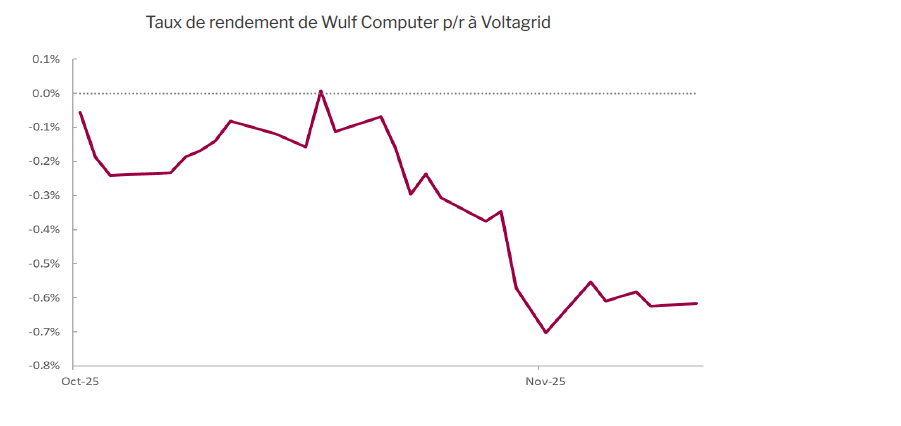 Source : Bloomberg, le pire rendement envisageable de Wulf Compute (SARL) (7,75 %, 2030) par rapport à celui de Voltagrid (SARL) (7,375 %, 2030)