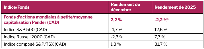 1 Tous les rendements signalés sont ceux des parts de catégorie F du Fonds. D’autres catégories de parts sont offertes. Celles-ci pourraient présenter des frais et des rendements différents. Les données standards sur le rendement du Fonds sont présentées ici https://penderfund.com/fr/fund/pender-global-small-mid-cap-equity-fund/