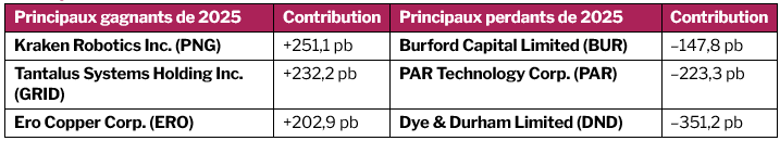 Les grands gagnants du Fonds ont livré de bons résultats. Ils forment le noyau de notre portefeuille et figurent parmi nos dix principaux actifs. De plus, chacune de ces entreprises est associée à des thèmes qui devraient, selon nous, attirer davantage d’attention en 2026.