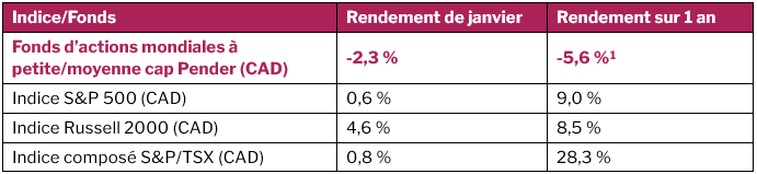 1 Tous les rendements signalés sont ceux des parts de catégorie F du Fonds. D’autres catégories de parts sont offertes. Celles-ci pourraient présenter des frais et des rendements différents. Les données standards sur le rendement du Fonds sont présentées ici https://penderfund.com/fr/fund/pender-global-small-mid-cap-equity-fund/