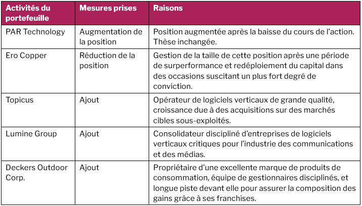 Ce recul a permis de redistribuer le capital là où le fossé entre le prix et la valeur intrinsèque s’était considérablement élargi. Nous avons tiré profit de cette dislocation en ajoutant des actifs à haute conviction et en prenant de nouvelles positions à valeur plus intéressante, car nous croyons que les perspectives du logiciel s’améliorent au lieu de se détériorer.