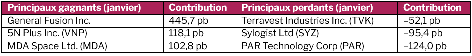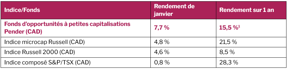 Le Fonds a dégagé un rendement de 7,7 % en janvier, ce qui commence bien l’année. Il a ainsi pris les devants sur les marchés boursiers canadien et états-unien, l’indice composé S&P/TSX ayant progressé de 0,8 % et l’indice Russell 2000 (CAD) de 4,6 %. La modeste performance du TSX est imputable en partie à la baisse du prix des matières premières, notamment des métaux précieux, ce qui a pesé sur les secteurs fortement liés aux ressources. Les actions canadiennes ont également été les victimes collatérales de la volatilité des marchés états-uniens causée par l’incertitude politique. En dépit de la pression subie à la fin du mois, les gains du début de janvier ont permis aux actions canadiennes de terminer le tout en territoire positif.