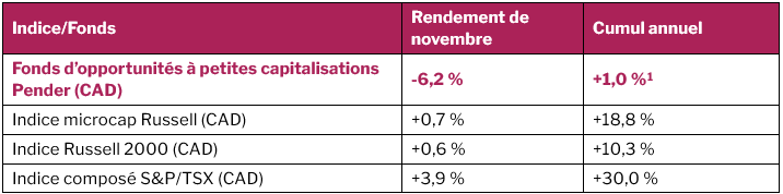 1 Tous les rendements signalés sont ceux des parts de catégorie F du Fonds. D’autres catégories de parts sont offertes. Celles-ci pourraient présenter des frais et des rendements différents. Les données standards sur le rendement des fonds d’actions Pender sont présentées ici : https://penderfund.com/fr/fund/pender-small-cap-opportunities-fund/.