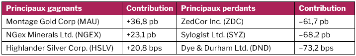 L’intelligence artificielle (IA) est également demeurée un thème important. Bien que celle-ci exerce une influence moindre sur le marché canadien, comparativement au marché américain, le boum mondial continue de créer un écart entre les entreprises dites « gagnantes » et « retardataires ». Shopify, qui occupe la deuxième pondération en importance sur la Bourse TSX, est considérée comme étant tributaire de cette thématique. En revanche, plusieurs entreprises de services logiciels et de TI ont été boudées en raison des risques perçus comme étant associés à l’IA.