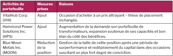 Nous avons été actifs tout au long du mois, renchérissant sur nos positions à forte conviction et en délaissant les entreprises pour lesquelles la thèse de placement ne tenait plus aussi bien la route. Cette rotation disciplinée fait partie intégrante de notre gestion du risque et permettra au Fonds de participer avec plus de ferveur lorsque les conditions s’amélioreront.