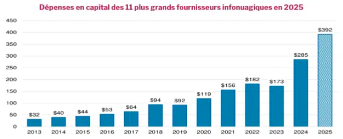Ce qui nous permet d’enchaîner avec un de nos thèmes macroéconomiques clés : les dépenses destinées à l’infrastructure de l’intelligence artificielle. Morgan Stanley, dans le cadre d’une mise à jour sur un projet de recherche qui fait le suivi de 11 fournisseurs infonuagiques[1] , a récemment rajusté ses projections en capital d’investissement à 392 milliards $ en 2025 (selon les prévisions d’entreprise mises à jour), ce qui représente une croissance annuelle de 38 %. Il s’agit d’une hausse de 29 milliards $ par rapport au mois dernier. Ce résultat représente 16,6 % du revenu, un sommet en tout temps. Le dernier sommet s’établissait à 13,1 % en 2024, la première année où les dépenses en capital en tant que pourcentage du revenu s’inscrivaient dans les nombres à deux chiffres au cours de la plus récente décennie. Nous détenons plusieurs entreprises qui répondent aux besoins de ce marché infrastructurel en croissance et sommes bien placés pour tirer parti d’une croissance soutenue de ce côté.