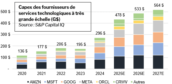 Nous estimons que l’intelligence artificielle (IA) est une technologie phare pour l’amélioration de la productivité. Nous détenons dans notre portefeuille plusieurs actifs tirant avantage de ce thème. De ce fait, nous suivons de près les investissements susceptibles de contribuer à son développement et à son adoption à grande échelle. Bien qu’il soit encore tôt, nous jugeons encourageants les progrès accomplis par les fournisseurs de services technologiques à très grande échelle (« hyperscaler ») afin que les investissements dans leur infrastructure IA dégagent des rendements.