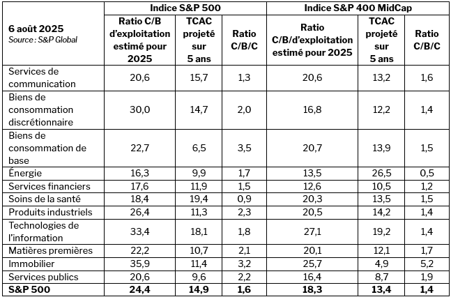 L’indice S&P MidCap 400 a affiché un rendement total de 1,6 % en juillet 2025, prenant ainsi du recul sur son pendant à grande capitalisation, soit l’indice S&P 500, par une marge de 62 points de base (pb). Sur une base de cumul annuel, l’indice MidCap et son rendement total de 1,8 % ont été en perte de vitesse de 677 pb par rapport à l’indice S&P 500, ouvrant ainsi la voie à des occasions de placement attrayantes dans l’arène des moyennes entreprises (cours/bénéfices prévisionnels de 16,4 x, ce qui représente un escompte de 6,2 x par rapport à l’indice à grande capitalisation). Le taux des flux de trésorerie d’exploitation de 5 % de l’indice MidCap est également intéressant si on le compare à celui de 3 % de l’indice à grande capitalisation.