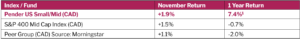 1 All Pender performance data points are for Class F of the Fund. Other classes are available. Fees and performance may differ in those other classes. Standard Performance Information for Pender’s Equity Funds may be found here: https://penderfund.com/fund/pender-us-small-mid-cap-equity-fund/.