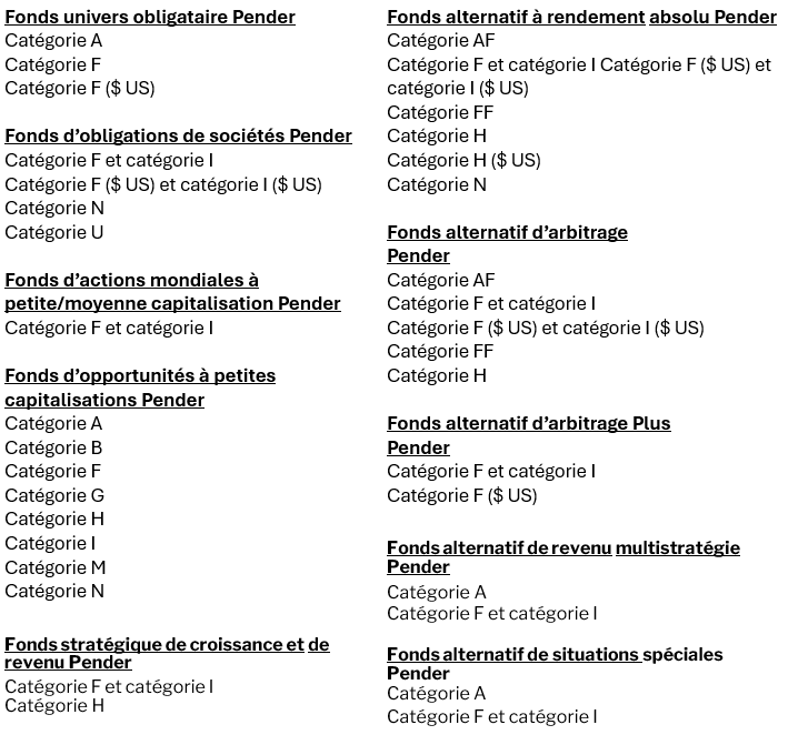 Pour faire suite aux communiqués qu’elle a publiés le 15 septembre 2025, le 1er octobre 2025 et le 22 octobre 2025, Pender annonce également qu’elle procèdera à la dissolution de certaines catégories de ses Fonds (chacune, une «catégorie dissoute» et, collectivement, les «Dissolution de catégories»), exception faite des catégories mentionnées ci-dessous, le 5 décembre 2025 ou vers cette date.