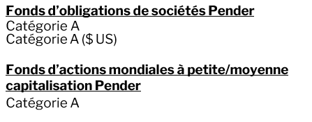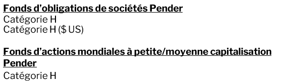 Rien ne garantit toutefois que les énoncés prospectifs s’avéreront exacts, puisque les résultats réels et les événements futurs pourraient différer sensiblement de ceux qui sont annoncés de façon implicite ou explicite dans ces énoncés. Par conséquent, les lecteurs ne devraient pas se fier indûment aux énoncés prospectifs et à l’information prospective. Ils doivent savoir qu’une telle information pourrait ne pas convenir à d’autres fins. Pender ne s’engage pas à mettre à jour les énoncés prospectifs, l’information prospective et les prévisions financières qui sont intégrés par renvoi dans les présentes, sauf si les lois sur les valeurs mobilières applicables l’exigent. Les lecteurs sont priés de lire les documents d’information continue des Fonds déposés auprès des autorités en valeurs mobilières de certaines provinces du Canada, qui se trouvent au www.sedarplus.ca.