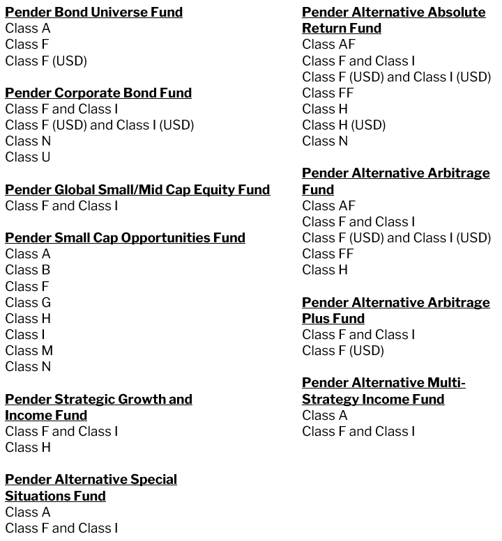 Under the Class Closures, unless a unitholder of a Terminating Class elects to redeem their units, such units will be converted into units of another class of the same Fund. A Termination Notice with more information has been mailed to unitholders of each Terminating Class. The Termination Notices are also available on Pender’s website at https://penderfund.com/legal-financial/.
